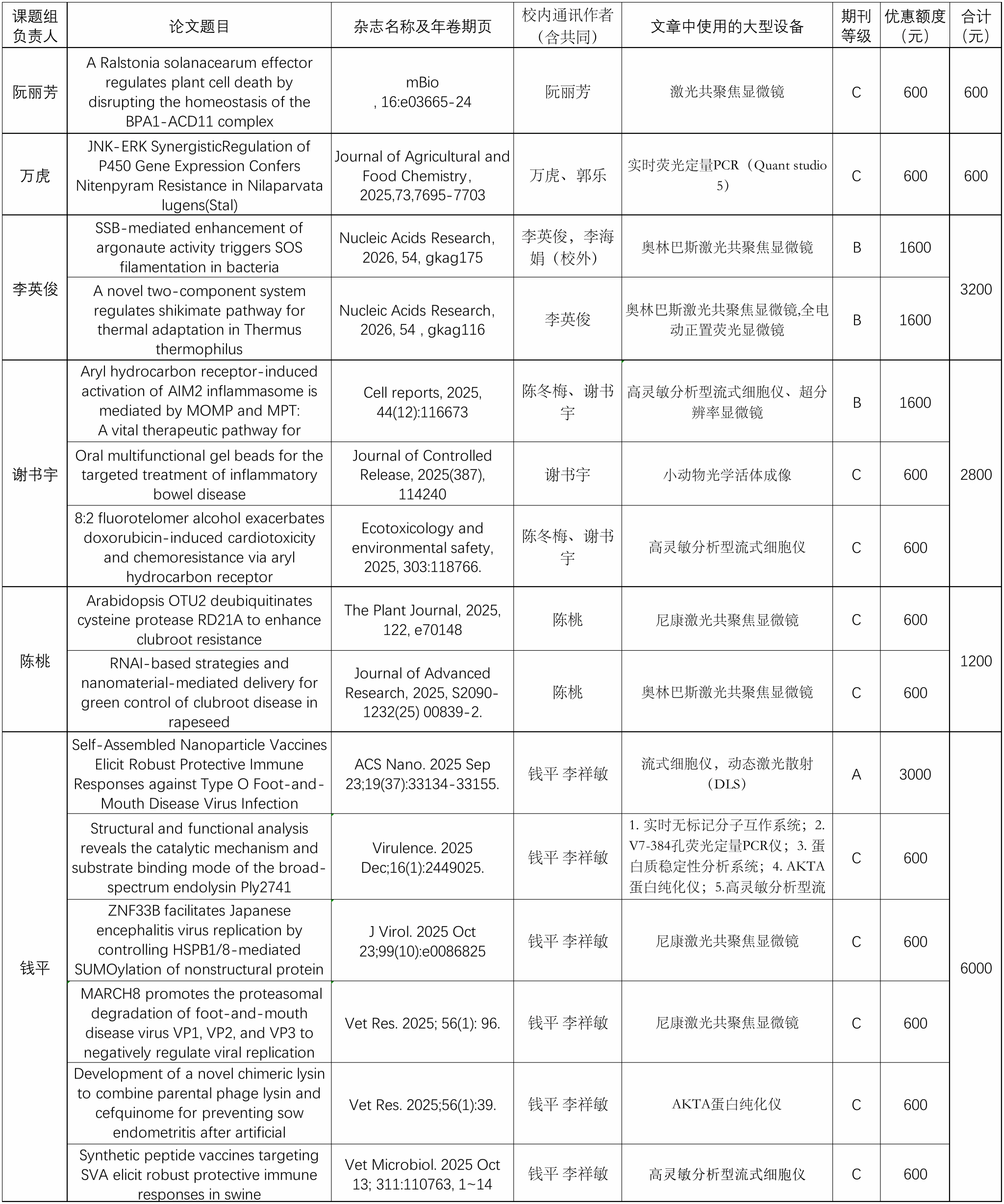 注:1经公示生效后,平台对课题组使用仪器设备费用进行核定时将根据优惠额度进行抵扣,优惠额度的有效期为一年,过期清零不累计;2.有部分申请不符合要求的,主要原因有:①论文发表的期刊未被《华中农业大学期刊分级目录》收录;②论文中未按照优惠使用办法中的要求进行致谢;③论文未涉及微重公共技术平台中40万以上的大型仪器设备使用;3. 微重公共技术平台和电镜平台目前独立运行,如涉及电镜设备使用的请向电镜平台提交优惠申请;4.目前实验室期刊分级目录正在调整,在未正式确定前仍按之前《华中农业大学期刊分级目录》执行;5.相关管理办法链接:https://hzaml.hzau.edu.cn/info/1052/5142.htm。